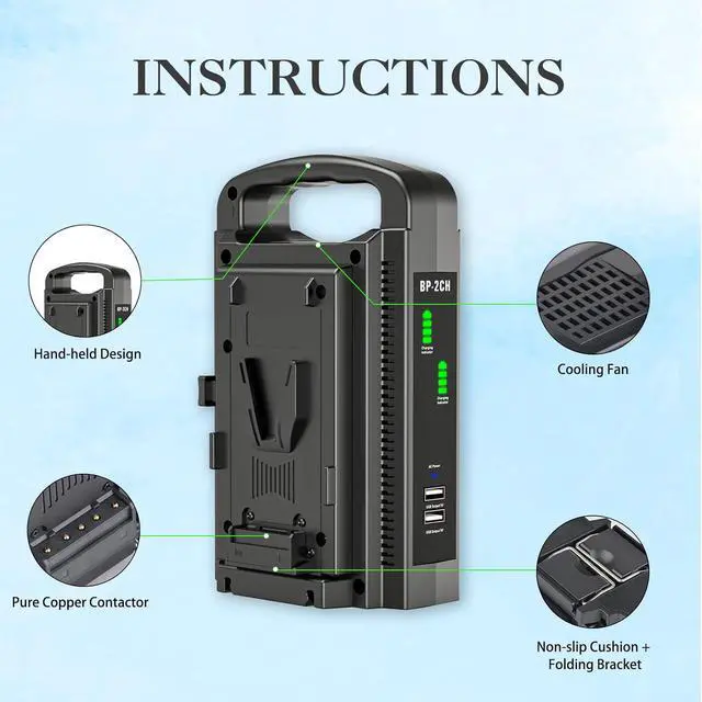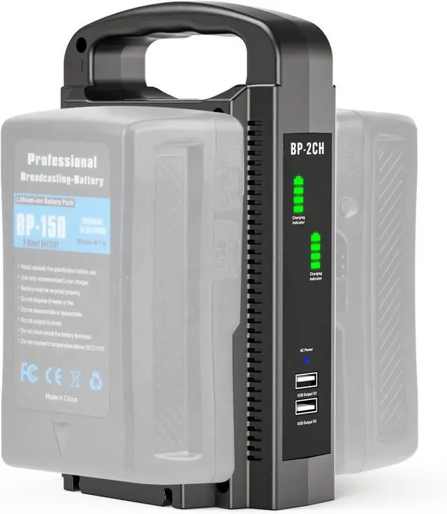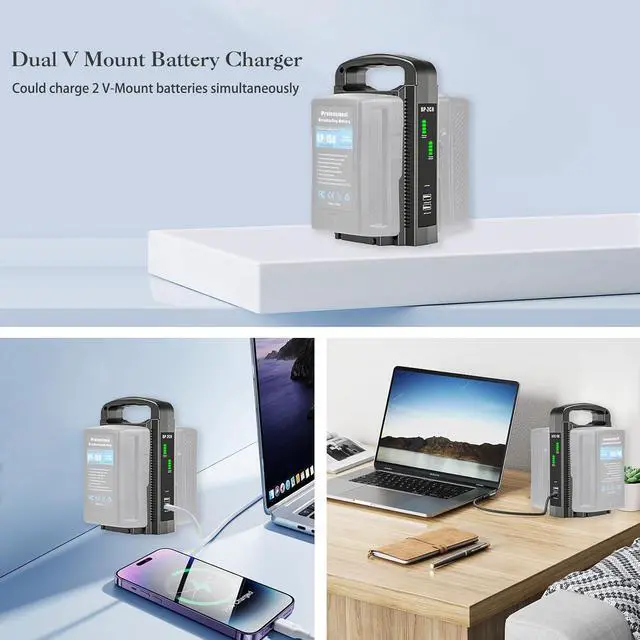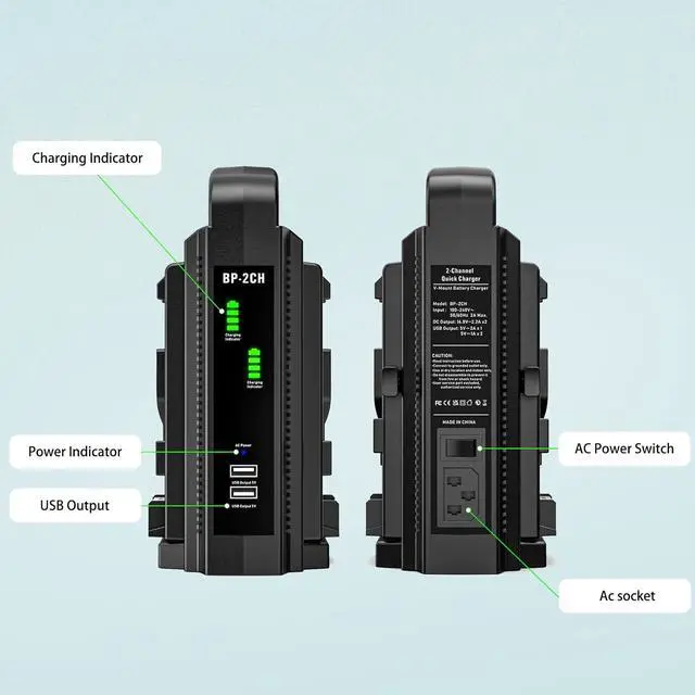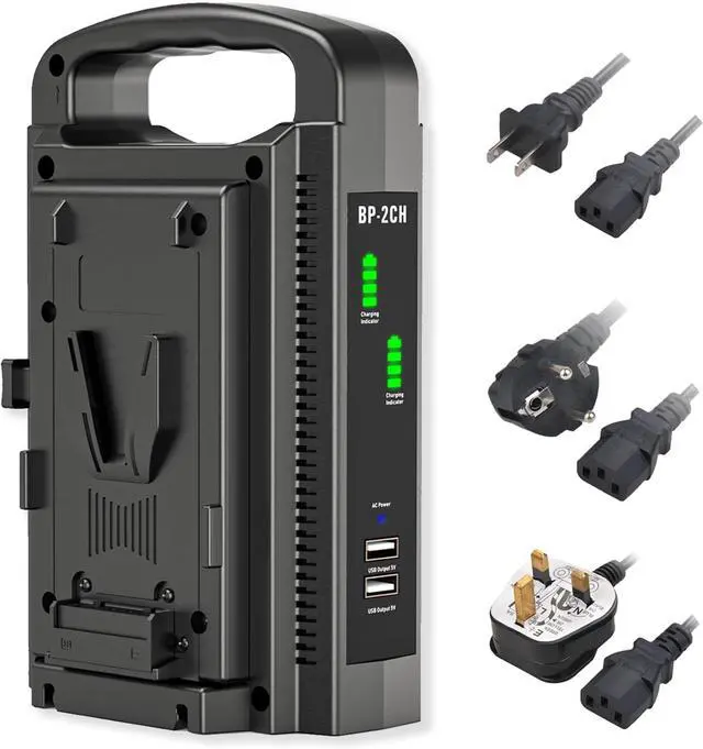 Package Included1 x V-mount charger, 1 x power cable (US plug), 1 x power cable (EU plug), 1 x power cable (UK plug). (Batteries are NOT included)