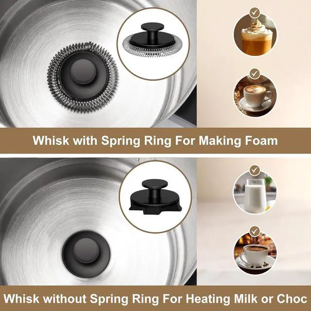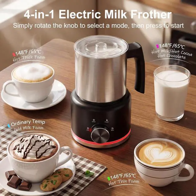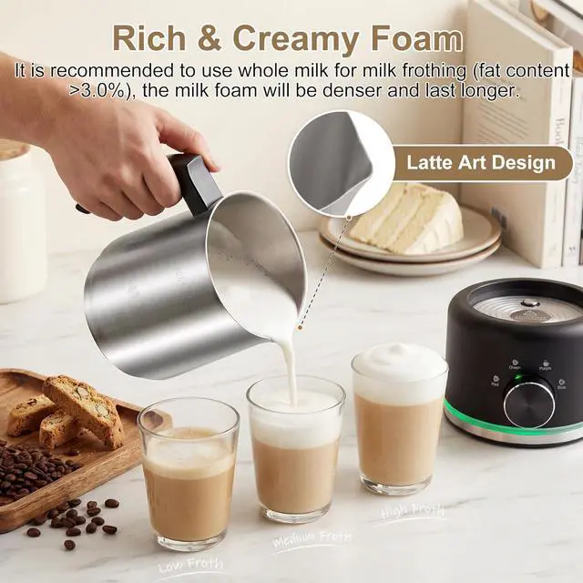 This milk steamer and frother is a combination for hot chocolate, hot thick foam, hot light foam, hot milk, cold milk foam, choose your favorite froth thickness to create a dense and silky milk froth, you can create unique artworks on your coffee. This milk frother is suits for coffee lovers, busy parents who want to make coffee, hot milk or hot chocolate for their children or to be a gift for your friends.