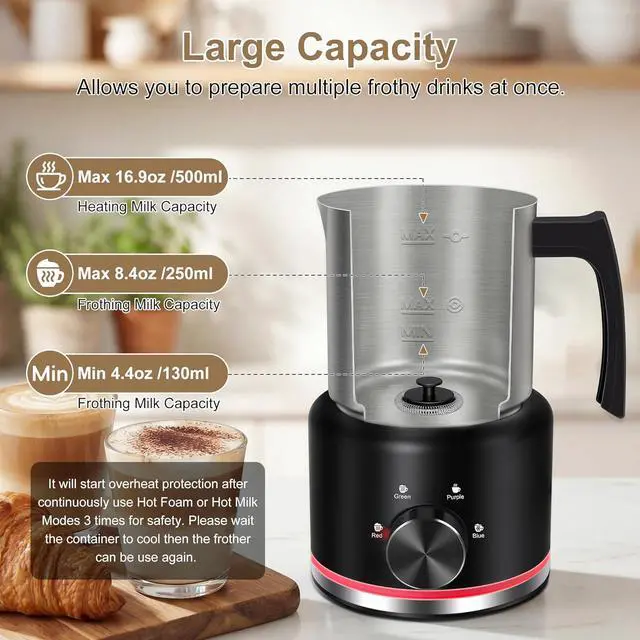 Our milk frother and steamer has huge capacity in 16.9 oz. It suits for your various needs for different scenes. The milk capacity between 4.4 oz and 8.4 oz for frothing milk and the milk capacity between 4.4 oz and 16.9 oz for heating milk. The machine will heat the milk first to specific temperature then start frothing what makes the milk foam denser and smoother.