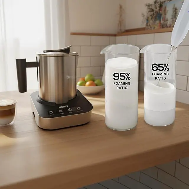 One-Touch Operation & Auto Shut-Off: Create perfectly frothed drinks with a single button. The automatic shut-off feature ensures safe operation, The frother automatically shuts off when your hot milk or hot foam reaches approximately 150°F (±10), hot chocolate reaches 175°F (±10), or when cold frothing is complete. Preventing overheating and improving energy efficiency. Enjoy worry-free frothing whether you're starting your morning or winding down in the evening