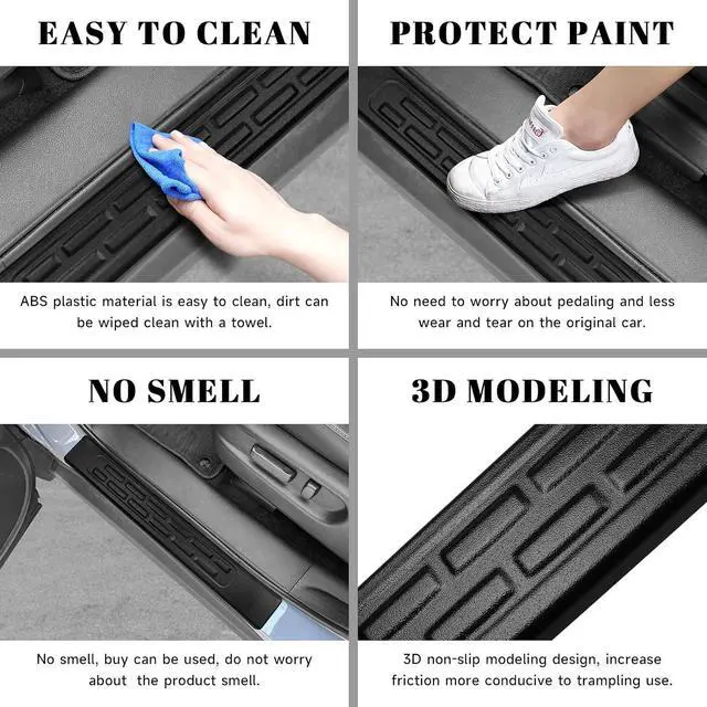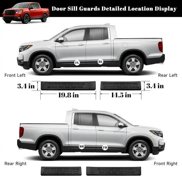 Size of car front door sill: 19.8 X 3.4 inch (2pcs). Size of car rear door sill: 14.5 X 3.4 inch (2pcs).