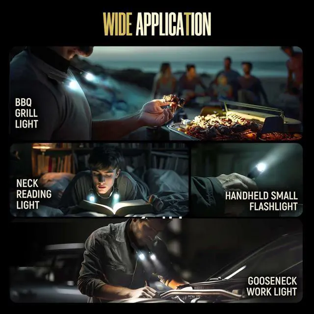 Widely Application: This versatile hands free flashlight is not limited to just one setting. When not in use at work, it can be used to illuminate a variety of tasks and activities. From BBQ and reading, to emergency repairs, outdoor adventures, and any other nighttime pursuits, this around the neck flashlight is the perfect companion. Mechanics and craftsmen will also find it indispensable for their work.