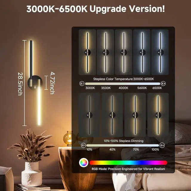 Premium Aluminum& Eye-Caring LED Dimmability: The battery operated wall sconce grafted from premium aluminum alloy for a sleek, minimalist look that elevates any decor. The sconces are lightweight, rust-resistant, and built to last. The integrated LED strip delivers flicker-free, uniform light through a PC diffuser. The dimmable, flicker-free soft lighting provides comfortable illumination, reducing eye strain for late-night work or relaxing reads.