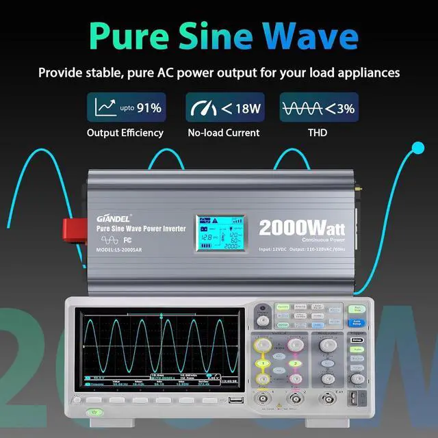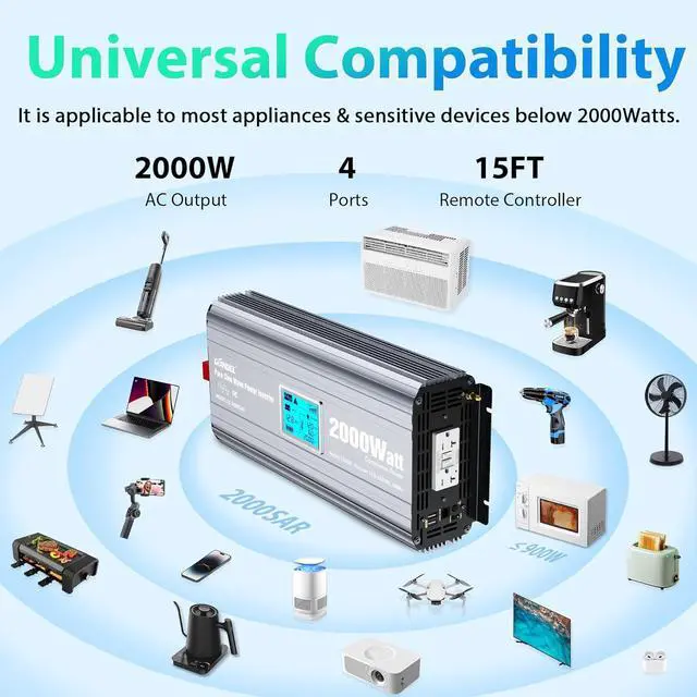 Widely Uses to protect appliancesIt is longer than other 2000 Watt inverters for FCC approval, its advanced pure sine wave technology provides quality AC equivalent to grid power which will protect and extend the life of your electronics and appliances, such as 900Watt microwave, freezer, Laptop, tablet, Audio etc. With its quiet and high inductive loads, the solar inverter operates with no buzzing sounds when your electronics are turned on and allow them to run smoother, cooler, and quieter