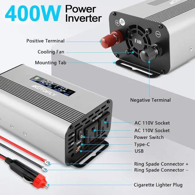 The 12V cigarette lighter plug is spring-loaded and fits snugly into the receptacle. You cannot get 400 watts from 12 volt cigarette lighter plug, needs dedicated connection cables for car battery. If you're going to be plugging this into car cigarette lighter, you should keep the wattage under 150, since that is what most car fuses are set for.