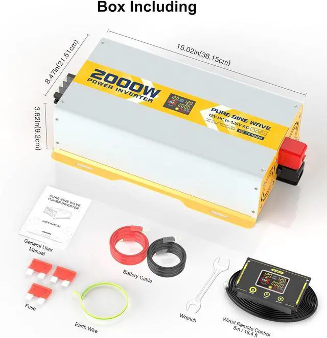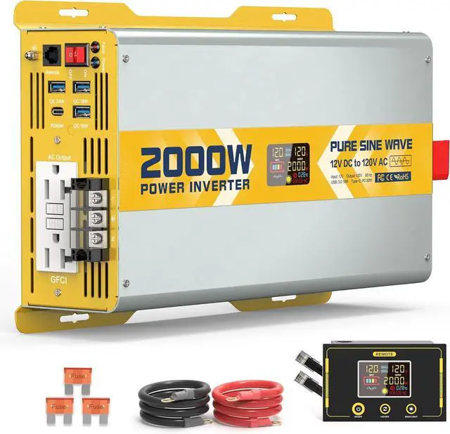 LED SCREEN& REMOTE CONTROLLER Icons on LED can directly show the running state of products quickly and accurately display abnormal problems. The rich accessory package allows you to use it freely. Inverter includes 2 120V GFCI AC output ports, 1 AC terminal board, 3 USB port 5V 2.4A, and 1 type-c port. Box contains 2 2.62 ft 3AWG positive and negative battery cable clips, a 1.64 ft ground wire, and 2 40A 32V fuses.