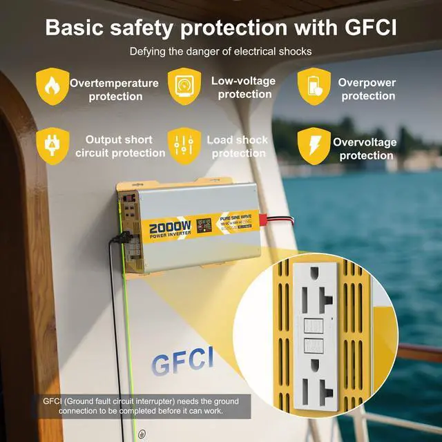 6 PROTECTIONS& GFCI OUTLETWe have configured a full range of powerful protections for this inverter: under-voltage protection, over-voltage protection, overload protection, over-temperature protection, short-circuit protection and reverse polarity protection. The GFCI (Ground Fault Circuit Interrupter) outlet allows you to use various electrical appliances more safely.