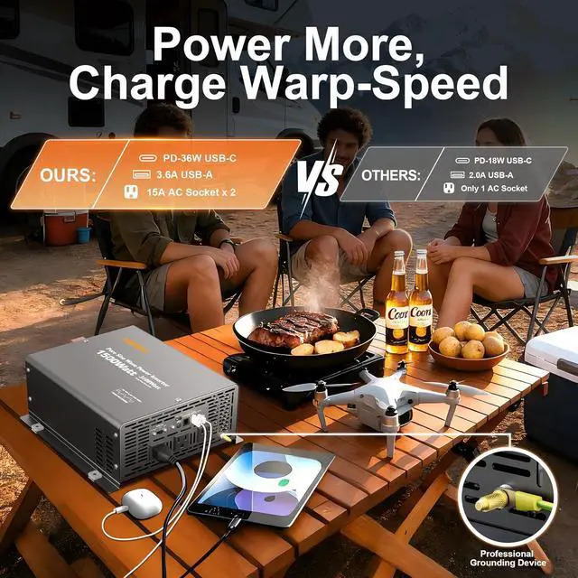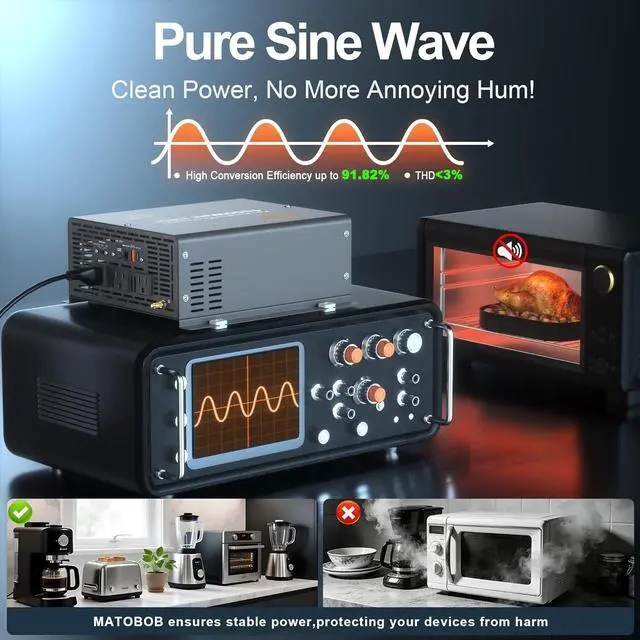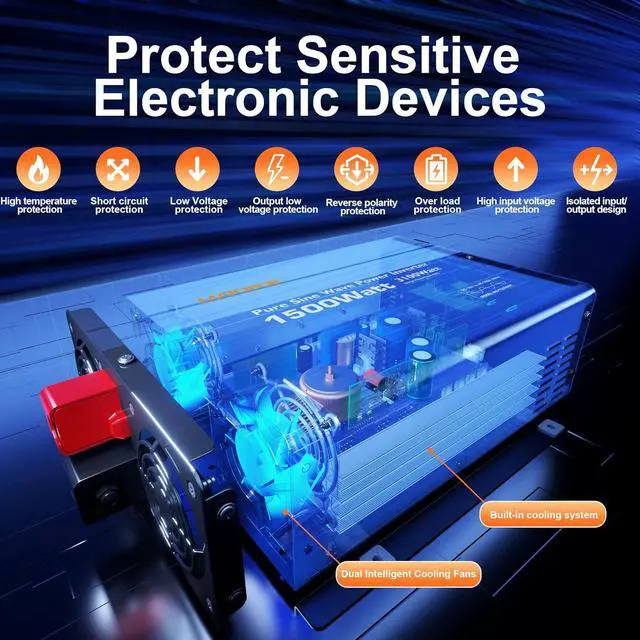 MULTIPLE SAFETY PROTECTIONS--The pure sine wave inverter delivers comprehensive protection with multiple safety features, including undervoltage, overvoltage, overload, over-temperature, short-circuit, and reverse connection safeguards. Combined with a rugged metal housing and an advanced built-in heatsink design, it ensures an optimized heat dissipation system for reliable performance and extended lifespan, even under demanding conditions.