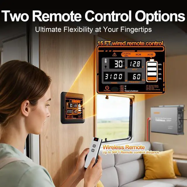 --The 1500-watt inverter features a 15-foot wired remote controller equipped with a smart LED screen plus an extra wireless remote. This screen provides real-time tracking of battery levels, output, internal temperature, and any errors, eliminating guesswork and empowering you to swap batteries and manage power efficiently. With its one-touch shutdown/restart functionality of wireless remote, this inverter excels in trucks, RVs, and various job sites, allowing you to monitor conditions in real-time from the comfort of your cab or campsite