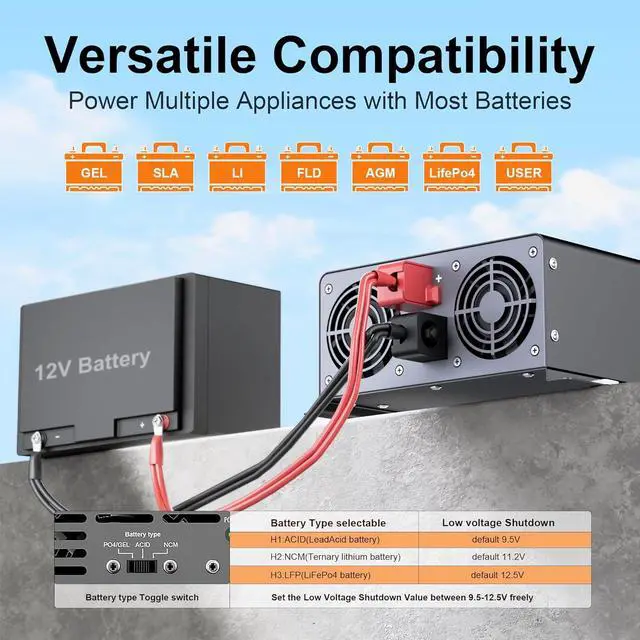 Battery Types Selectable--The new 1500Watt inverter features a Battery Type Selector Toggle Switch, offering seamless compatibility with lithium-ion (Li-ion), LiFePO4 (long-life, high safety), NCM (high energy density), and lead-acid batteries. This innovative design empowers users to effortlessly switch between battery types, ensuring optimal performance for diverse applicationswhether powering home appliances, outdoor equipment, or renewable energy systems. By adapting to your specific needs, the inverter delivers smarter versatility, making it an ideal choice for modern energy solutions.