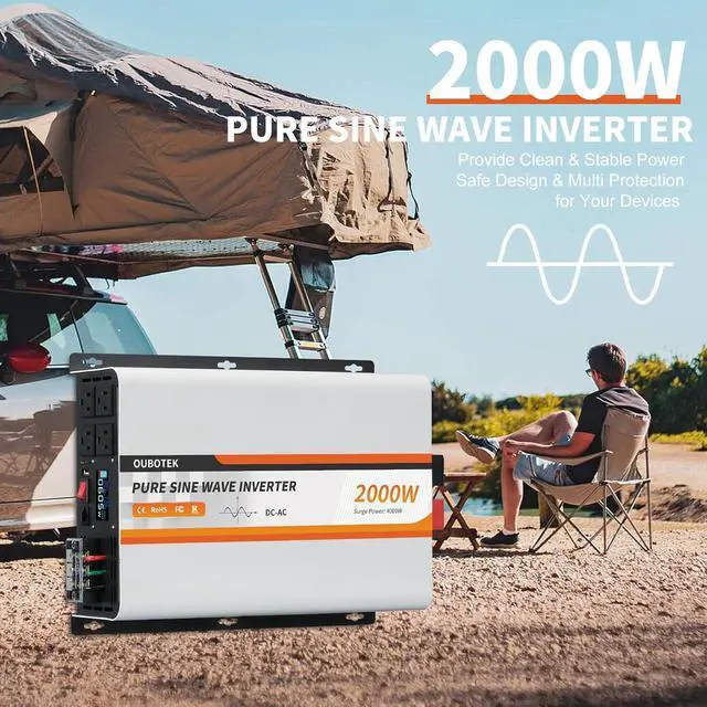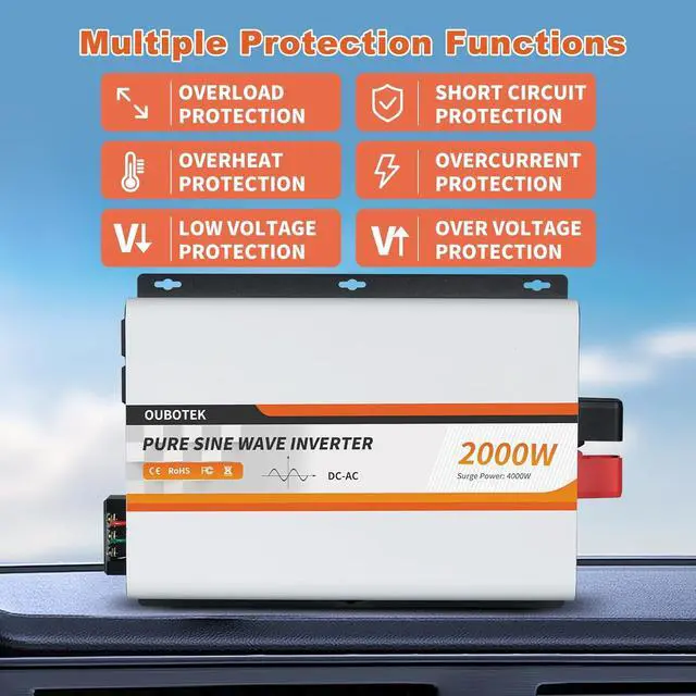 SAFETY PROTECTION: The 2000W true sine wave inverter offers advanced safety features, including protection against low/high voltage, overload, short circuit, and over temperature, ensuring your devices are well-protected