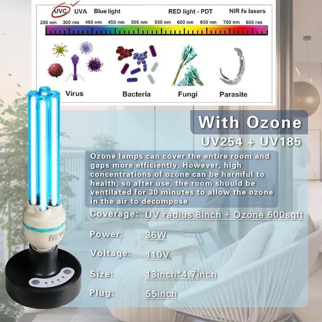 CAUTIONHuman/Pets/Plants cant be exposed to the UV Light! Must Leave the room when lamp is working. After use, there will be a smell of ozone in the room, please open the doors and windows to ventilate until the smell disappears (about 30 minutes).