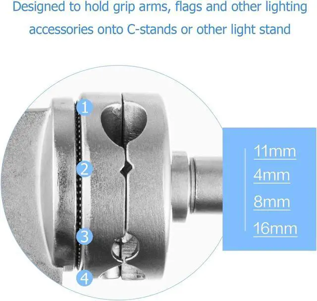 Application: 4 holes of different diameters allow any accessory with a 4mm / 8mm / 11mm / 16mm mounting stud or tube, such as boom arm, flag reflector. And compatible with most of light stand.