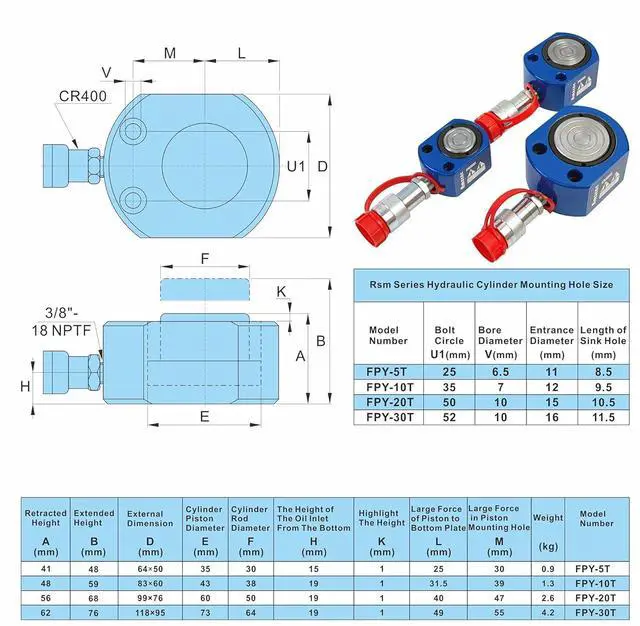 Low height:5 ton Ultra-Thin Hydraulic Lifting Cylinders Stroke 7 mm0.28" provide the maximum power to height ratio. A compact, low height cylinder design is ideal for confined spaces where other cylinders will not fit