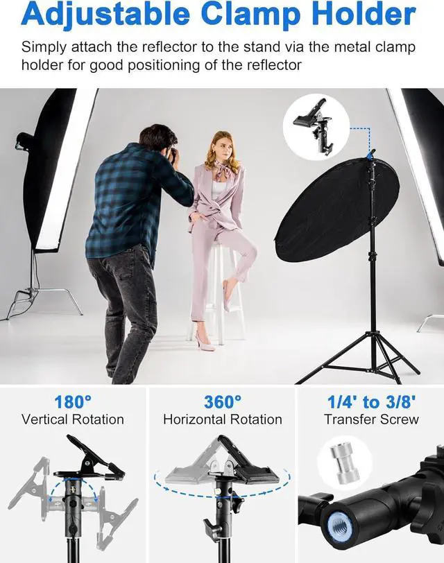 Adjust clamp holder: Offer a metal clamp holder for studio reflectors that fits light stands with a 3/8 " thread.can adjust 180°in angle and 360° in direction for ideal lighting effect
