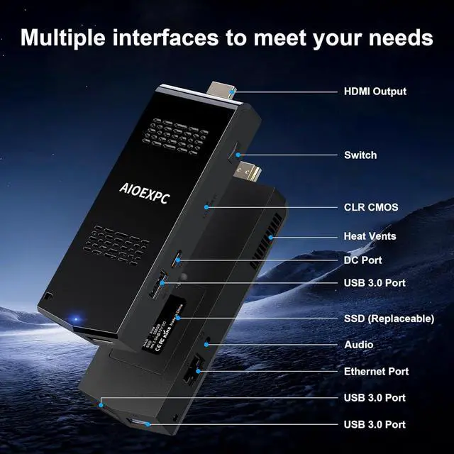 Abundant interfacesTaking the needs of users into consideration, this mini computer stick is equipped with 3 USB ports, 1 Gigabit LAN port, 1 3.5 mm combo audio jack, and comes with an HDMI extension cable. You can connect a variety of devices such as monitors, projectors, printers, headphones, speakers, keyboards, mice, etc.