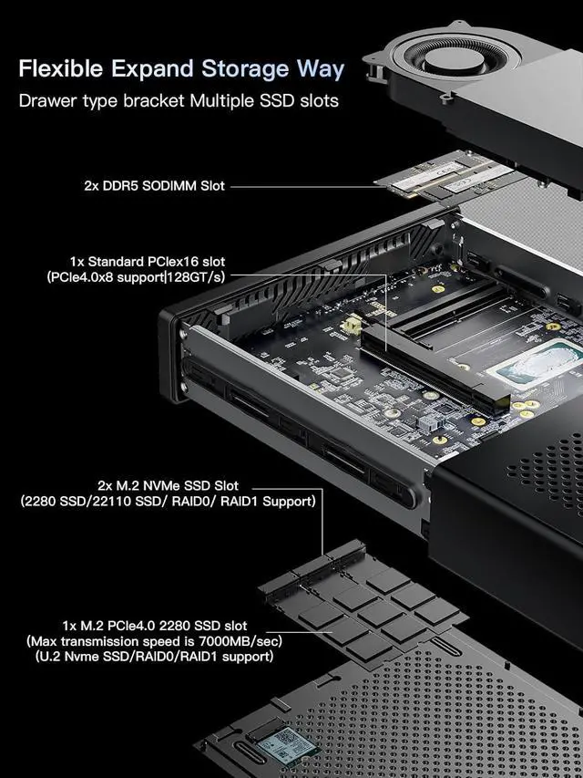 Flexible ExpandabilityThis Workstation equipped with two DDR5-5200 slots + M. 2 2280 PCIe 4.0 SSD slot. This SSD slot compatible with RAID0 and RAID1, supports U. 2 SSD. U. 2 enterprise-grade solid-state drives can easily achieve larger capacities, reaching 7.68 TB/ 15.36 TB or more on the same four PCIe channels. With two more M. 2 NVMe SSD Slots(compatible with M. 2 2280 SSD/enterprise class 22110 SSD/RAID0/RAID1), you can store movies, videos, photos, important files easily. Whats more, it also comes with 1x standard PCIex16 slot(PCIe 4.0 x8 compatible\128GT/s), you could also expand the graphics card -- RTX 3050 (TESTED).