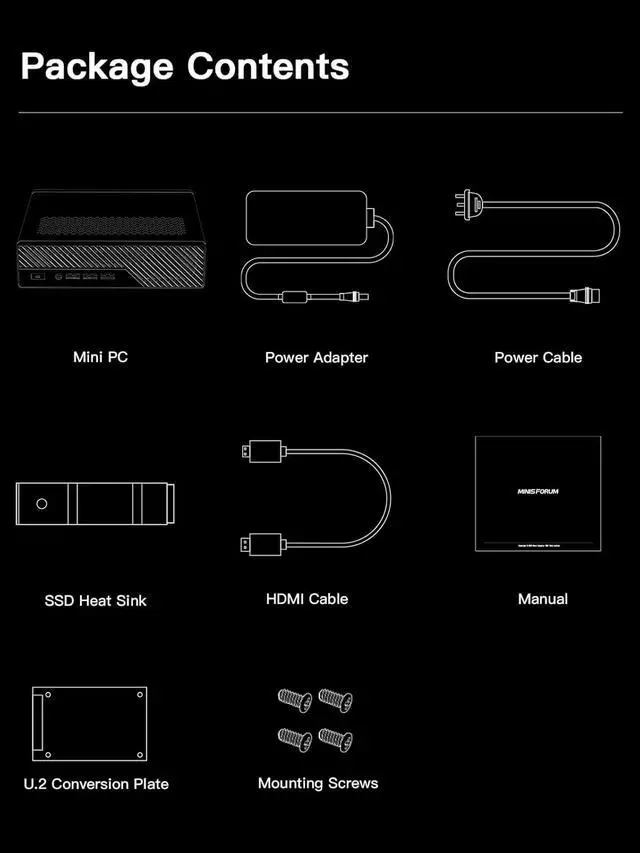 Package contents 1xMS-01 MiniWorkStation, 1x U. 2- M. 2 Conversion Adapter, 1x Power Adapter, 1x Power Cord, 1x SSD Heat Sink, 1x HDMI Cable, 1x Screw Set, 1x Manual.