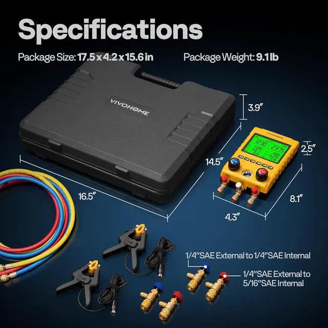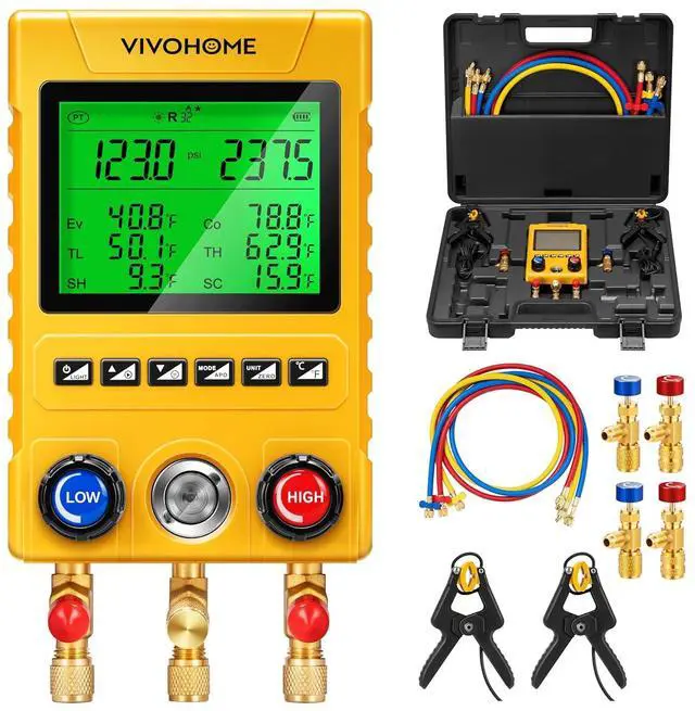 USER-FRIENDLY DESIGN: Features a large LCD screen with backlight and zero-level menu design, it provides easy-to-read data results even in dim lighting; Equipped with intelligent APO function to detect idle status and shut down automatically, saving energy; The manifold gauge can measure dual pressures and temperatures simultaneously, featuring automatic multi-unit pressure conversion and Celsius and Fahrenheit temperature conversion to meet different needs
