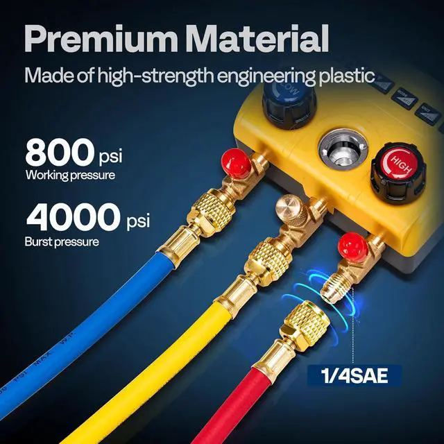 PREMIUM MATERIAL: The instrument is made of high-strength engineering plastic, making the entire unit sturdy and durable; The hoses are crafted from premium brass for excellent sealing and long-term durability with a burst pressure of 4000 psi; Includes two anti-freeze safety valves (1/4-1/4 and 1/4-5/16) to ensure safe refrigerant flow and protect users from accidental contact with frozen parts