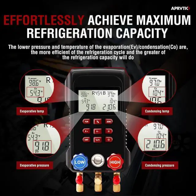 Real-Time Superheat& Subcooling: The manometros digitales para refrigeracion simultaneously displays real-time superheat and subcooling values with dual temperature clamps, enabling fast and accurate system diagnostics and adjustments.