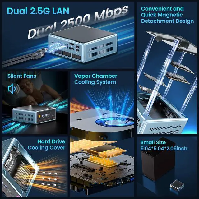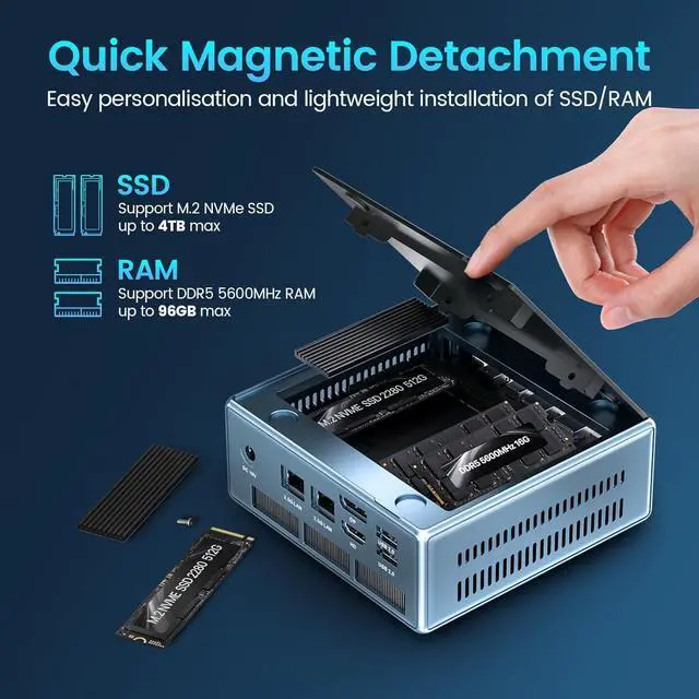 Convenient and quick magnetic detachment design: The WO-4 Mini PC features a convenient and quick magnetic detachment design. When you have any upgrade or configuration needs, you can simply open the magnetic casing to perform operations, greatly simplifying the process of meeting your personalized configuration requirements.
