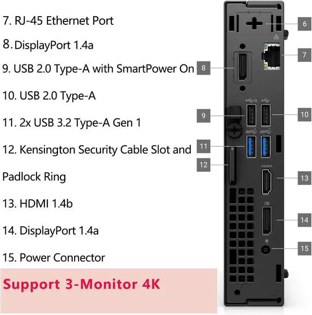 Rear: 1 RJ-45 Ethernet Port, 1 USB 2.0 Type-A Port (480 Mbps), 1 USB 2.0 Type-A Port (480 Mbps) with SmartPower On, 2 USB 3.2 Type-A Gen 1 (5 Gbps) Ports, 1 DisplayPort 1.4 a Port, 1 HDMI 1.4 b Port, 1 Power Adapter Port.