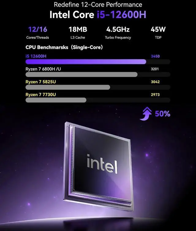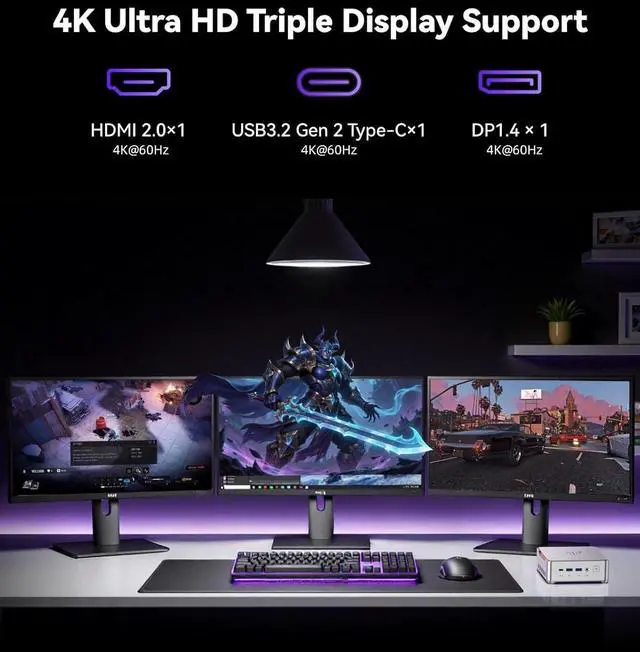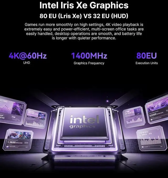 4K@60Hz HD DISPLAYImmersive triple-screen linkage, 4.50GH z graphics, 4K@60Hz high-definition resolution (4096 x 2160), 1400MHz dynamic frequency, can realize a variety of combinations of triple screen, horizontal screen and vertical screen. 2.5GH z x 5GHz dual-band WiFi 6, Gigabit Ethernet, and Bluetooth 5.2 make transfers and downloads smoother.