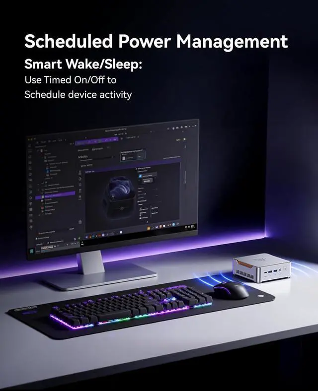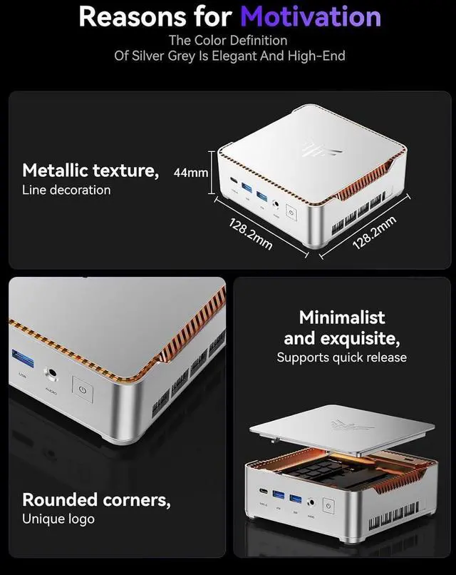COMPACT BODYThe P2 mini pc in·tel measures only 5.04 x 5.04 x 1.63 inches and features an innovative mini pc computer design, making it just a fraction of the size of traditional desktop towers, elegantly saving desktop space. With a VESA mount, you can easily hide it behind your monitor or place it in your living room TV cabinet, perfectly integrating into any home or office environment, saying goodbye to cluttered cables and bulky cases.