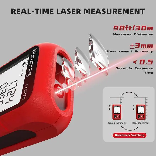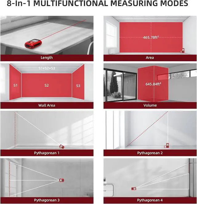 [Rechargeable& Energy-Efficient] Powered by a built-in rechargeable battery with USB Type-C fast charging. A single charge supports up to 5, 000 measurements. The laser auto-shuts off after 30s of inactivity, and the backlight turns off after 90spress any key to reactivate. The laser tape measure device powers down completely after 180s of non-use. Never worry about wasting energy by forgetting to turn it off! The LCD backlit display shows real-time battery status, eliminating range anxiety.