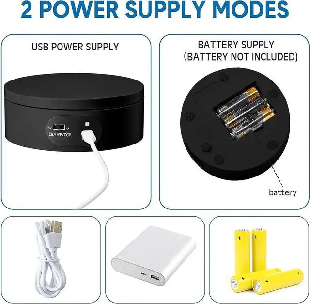Power Supply Methods: the photography turntable for glitter tumbler has a USB port and comes with a USB power cable(The latest batch of products has been upgraded to Type-C Port and Type-C power cords); Besides, the battery can be installed at the bottom of the turntable, so you can choose the appropriate power supply mode according to your preferences or the actual needs