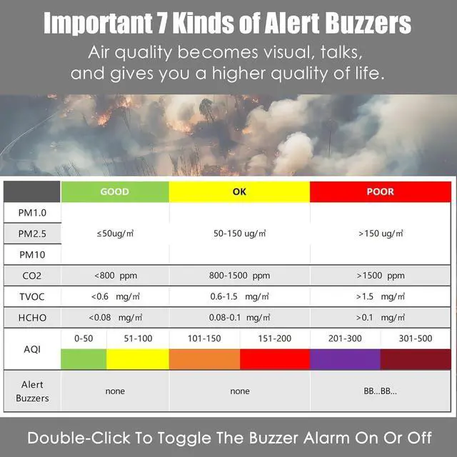 • Professional 16-in-1 Real-time Air Quality Monitor: With real-time detection of PM1.0 \ PM2.5 \ PM10 \ CO2 \ TVOC \ HCHO \ TEM \ HUM, along with 7 kinds of AQI alert buzzers function, this monitor ensures you always know what's in the air around you.