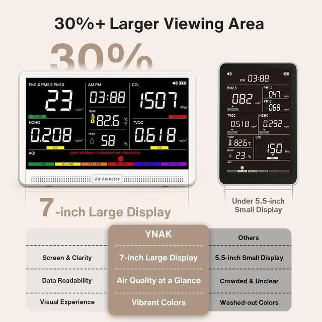 Real-Time AQI Alert BuzzersOur air quality monitor provides real-time monitoring and alerts for pollutants like CO2, PM 2.5, PM 1.0, PM10, HCHO, TVOC, Temperature, Humidity, and AQI, with 7 distinct alert functions. Stay informed with clear alerts and rest easy with a mute button to silence alarms. Your health and comfort are our priority