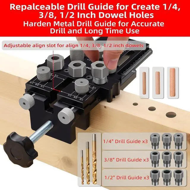 Dowel Jig Kit for Woodworking Fit 1/4, 3/8, 1/2 Inch Dowel Joints dowel jig kit fits for all kinds of wood dowel joints with repeat stop system make wood joinery fast, accurate and easily.
