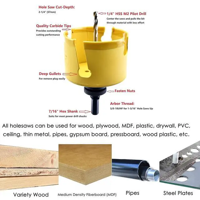 Tackle toughest cutting jobs with precision using 8-1/16-Inch (205mm) TCT Hole Saw. This heavy-duty carbide-tipped holesaw features an impressive 2.25" cutting depth, making it ideal for professional and demanding applications. The robust diameter blade is engineered to power through multiple materials including asphalt, brick, concrete, gypsum, limestone, tile, wood, and MDF with precision and efficiency. 2.25 inches cutting depth provides versatile hole-making capability in a single pass for wide applications, and reducing time and effort on larger hole demanding projects. The tungsten carbide teeth (TCT) provide superior durability and cutting performance compared to standard hole saws. Each hole saw comes securely packed in a rigid coded box to keep components protected and organized for safe storage, transport, easy identification and easy organization in your workshop and toolbox. Standard 5/8-18UNF thread connection ensures compatibility with most standard arbors and power drill systems for easy installation and use. This versatile hole saw is perfect for contractors, construction workers, electricians, plumbing, HVAC installation, handyman, and serious DIY enthusiasts who need to create precise holes in challenging materials. The saw design allows for clean, accurate cuts while maintaining stability throughout the cutting process.