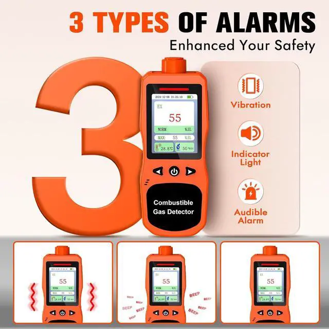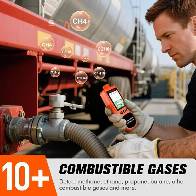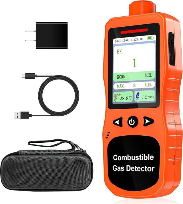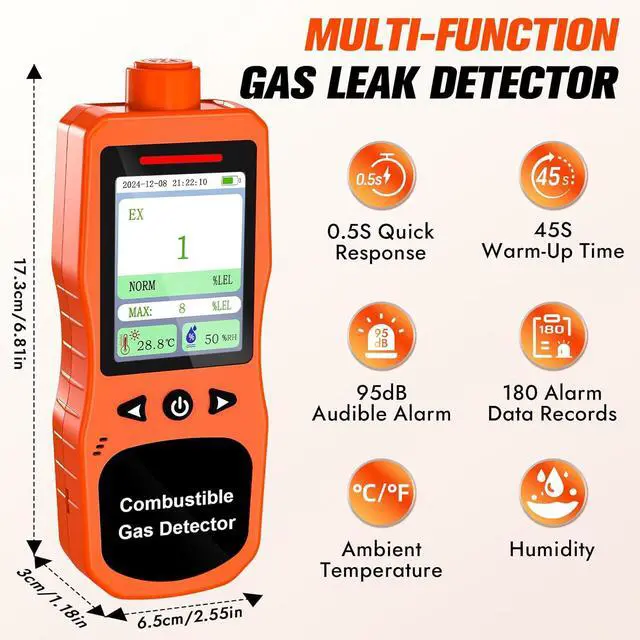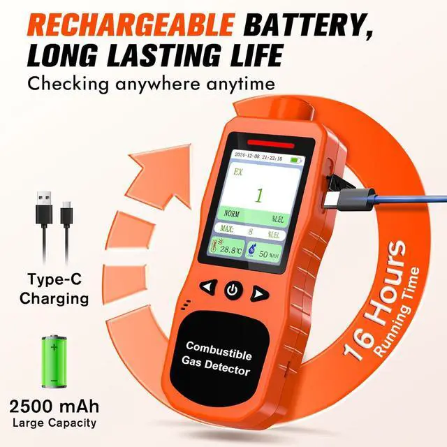 User-Friendly& Portable: natural gas leak detector comes with a 2.8 -inch color screen to display real-time %LEL readings, Max %LEL values, ambient temperature(/) and humidity levels; With auto/manual power off to conserve energy and a clip-on design for hands-free operation.