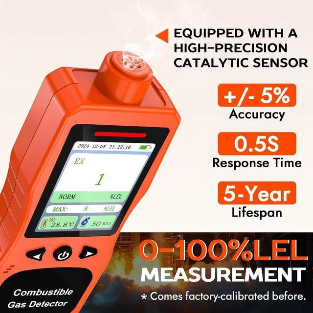 Handheld Combustible Gas Detector: Factory calibrated gas sniffers, just turn on to detect natural gas instantly. This propane gas detector with 5-Year sensor lifespan, its must-have handheld gas detectors for home natural gas, RVs, water heaters, gas pipelines, coal mines and industrial safety. (Please allow 45 seconds for warm-up before operation! )