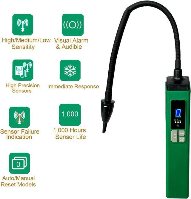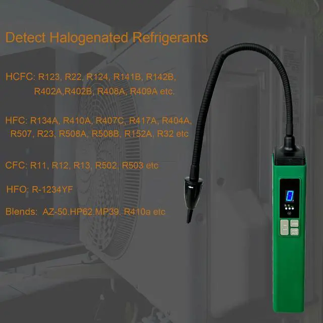Universal Refrigerant CoverageDetects ALL halogen-based coolants: CFCs, HCFCs, HFCs, HFOs (including newer R1234YF) + blends like AZ-50/MP39. certified sensor responds in <1 second with zero false positives. Powered by 4x AA batteries (included).