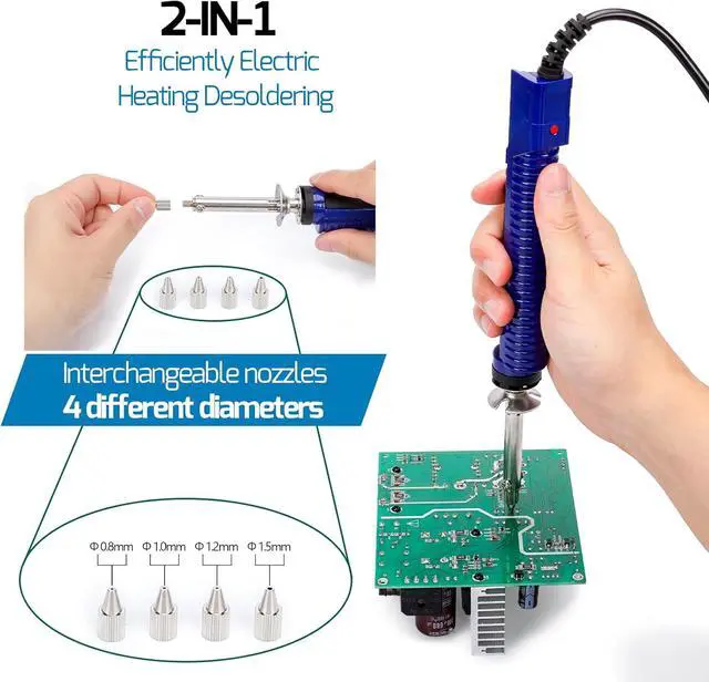 Easy to operate: It needs 3 minutes of preheating when connected to power. To use, charge the piston, melt the solder 100%, and press the release to extract the solder. Our desoldering kit includes 5 desoldering nozzles that are replaceble. (Nozzles are consumable items)