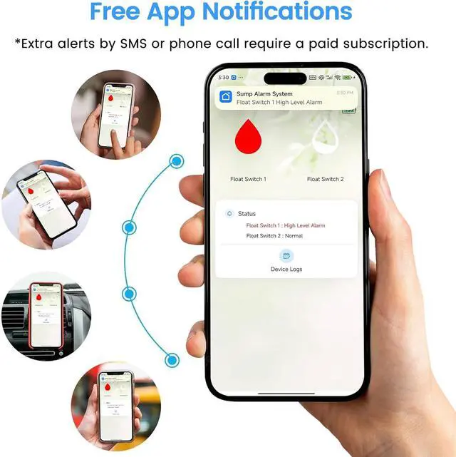 Anytime: Get real-time notifications directly to your smartphone via the Smart Life App. enjoy free app push notifications, or optional paid for additional Text/SMS, email or phone call remind, Stay informed of water level changes whether you're at home or away.
