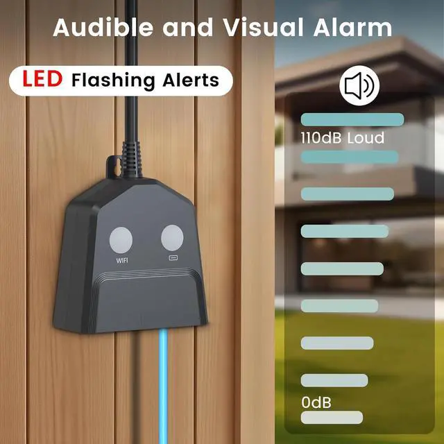 & App Notifications: Never miss a warning with ourcomprehensive alert system. A piercing 110dB siren, bright flashing LED lights, andinstant app notificationswork together to ensure you're alerted through sight, sound, and your mobile device. The PX65 waterproof rating allows it to withstand heavy rain, making it a high/low water level alarm suitable for both indoor and outdoor use. Furthermore, the Smart wifi sump pump alarm system supports to sharedevice to your family and friends (up to 20 users), achieve joint monitoring andmanagement.