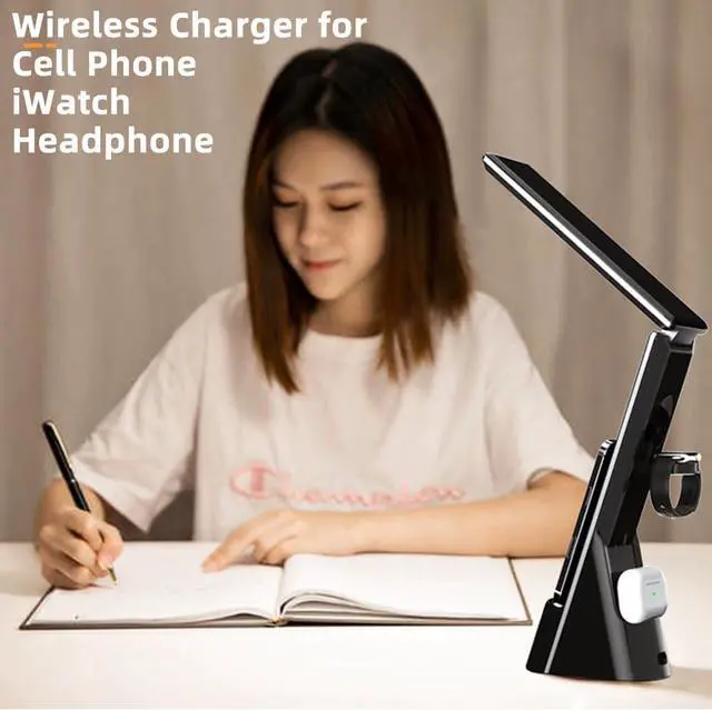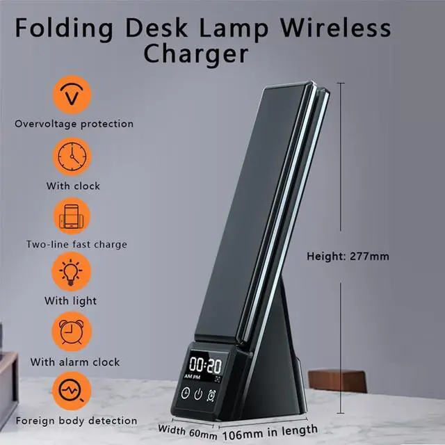 6in1 Multifunctional Foldable LED Desk Lamp with Wireless Charger Digital Alarm Clock Eye-Care Lighting 3 Color Modes 15W Qi Charger for Phone/Headphones, Watch Compatible-Black