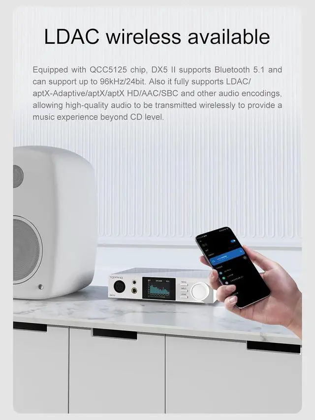 Bluetooth 5.1 & LDAC Wireless DAC Enjoy high-quality Bluetooth DAC amp experience with DX5 IIs support for LDAC, aptX Adaptive, aptX HD, AAC, and SBC codecs. The built-in QCC5125 ensures wireless audio quality beyond CD level perfect for modern streaming needs.