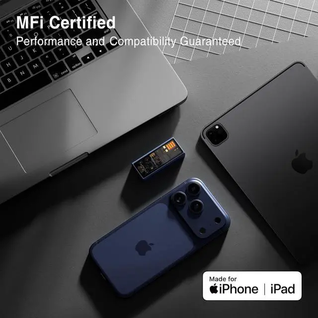 [MFi certified] The "i" suffix in M15i indicates that the M15i is MFi certified. MFi certification means perfect support for iPhone/iPad and the ios ecosystem, meeting stringent comprehensive requirements for external device power consumption and compatibility, and also avoiding the risk of damage to the phone and system caused by using incompatible USB devices.