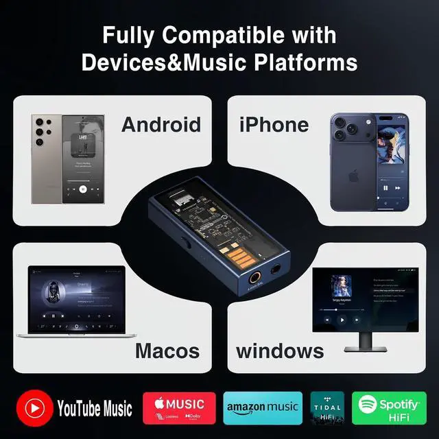 [Widely Compatibility] Workable well with computers, Smartphones, and Laptops. High compatibility with iOS, Harmony OS, Android versions 5.1 + and Windows 10+ version, enables you enjoy your lossless Music with your preferred device anytime, anywhere.