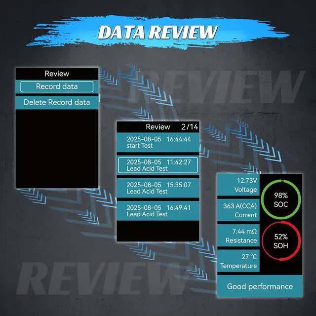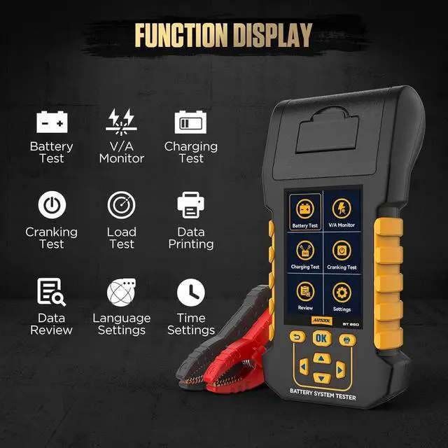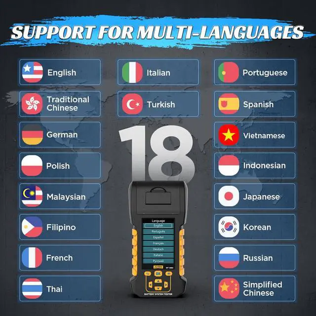 More SettingThis battery tester automotive can select from up to 18 languages. The tool self-test setting allows the device to maintain the accuracy of data reading. Firmware upgrade via USB, the device reboots into boot mode and the device connects to the USB cable to upgrade via the PC's software.