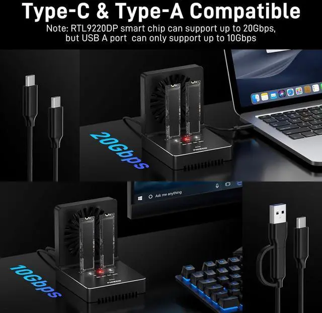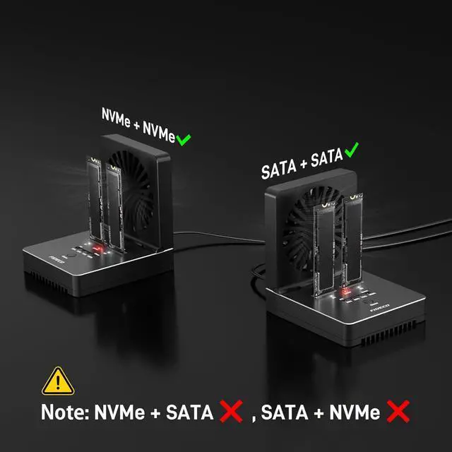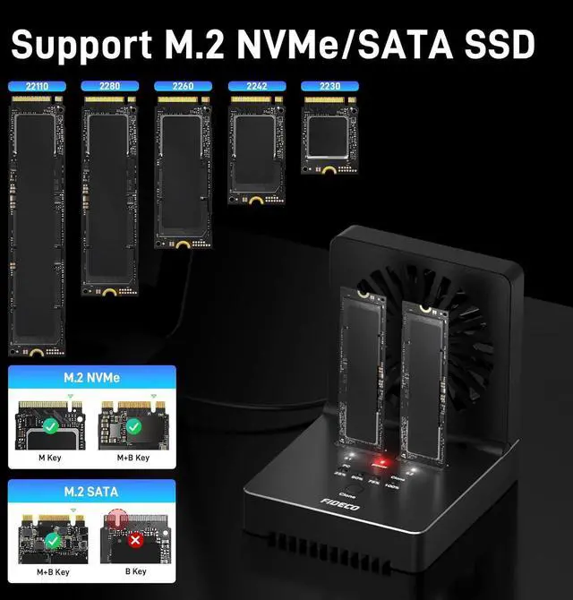 Foldable Cooling Fan NVMe SATA cloner dock is engineered with one foldable cooling fan to help cool your SSDs and make them maintain in a cooler environment. You do not need to worry about the problem of SSD overheating anymore. This device can absolutely help prolong the lifespan of your SSDs.