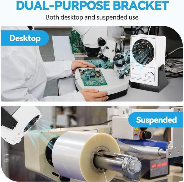 Two ways of using are recommendedDesktopYou can directly place the ionizing air blower on the desktop, aim the fan at the object that needs to eliminate static electricity, turn on the power, adjust the air volume, and quickly eliminate static electricity on the object.