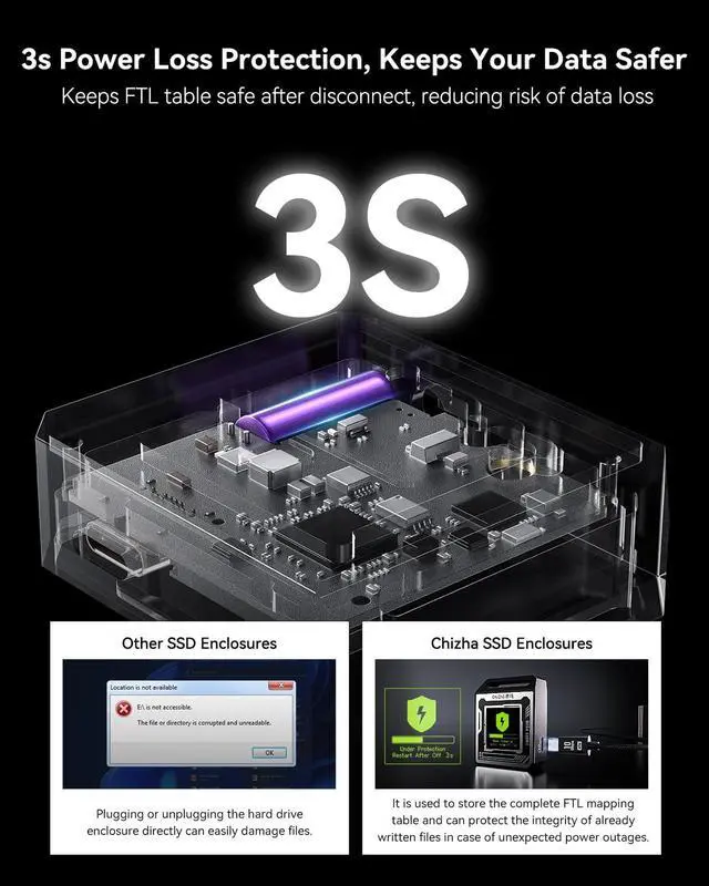 Power Loss Protection: Built-in capacitors provide around 3 seconds of protection during power loss, allowing your SSD to complete critical writes. Actual protection time depends on your SSDs power consumption, preventing data loss or disk damage
