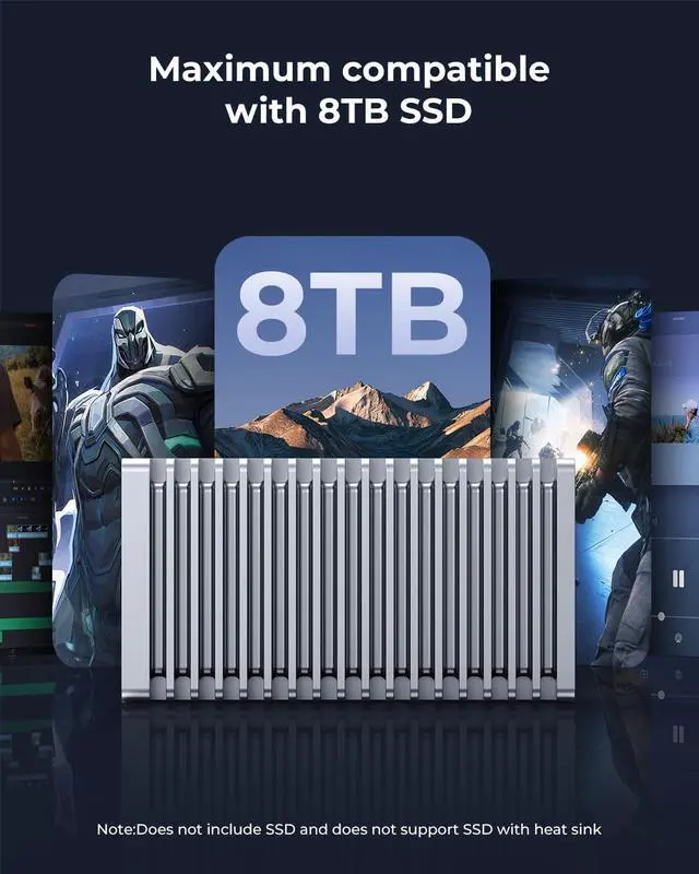Supports up to 8TB drives: This enclosure is compatible with drives up to 8TB, giving you ample space for work, gaming, and video playback anytime, anywhere.